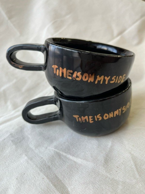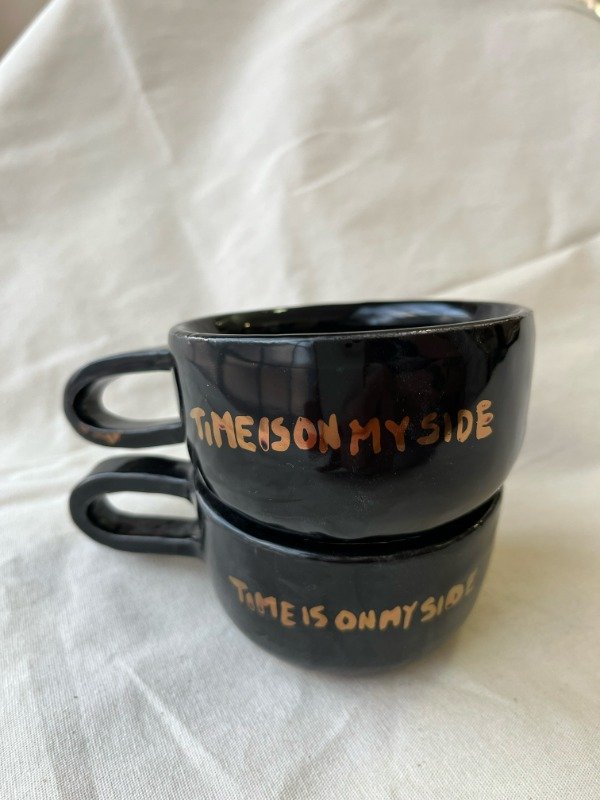 Esmaltados a mano con esmalte negro y frases con lustre de cobre.