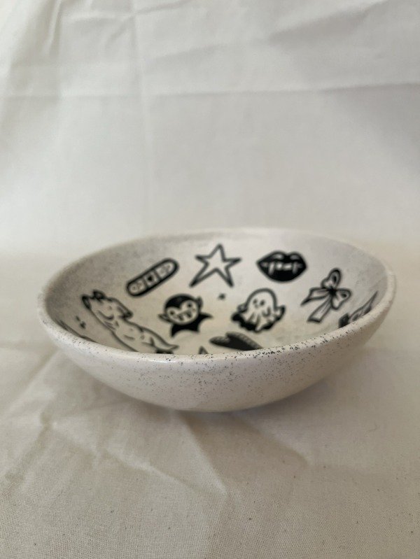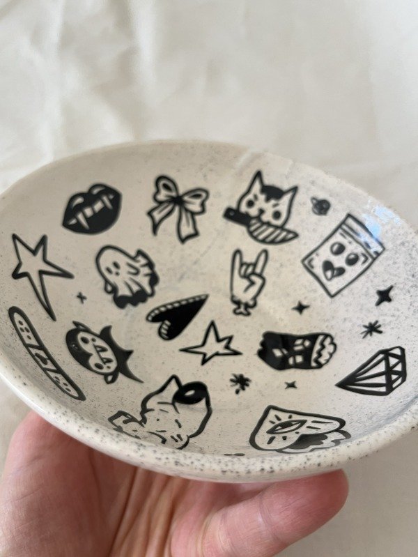 Cuenco esmaltado con blanco jaspeado y calcos ilustrados por nosotras.