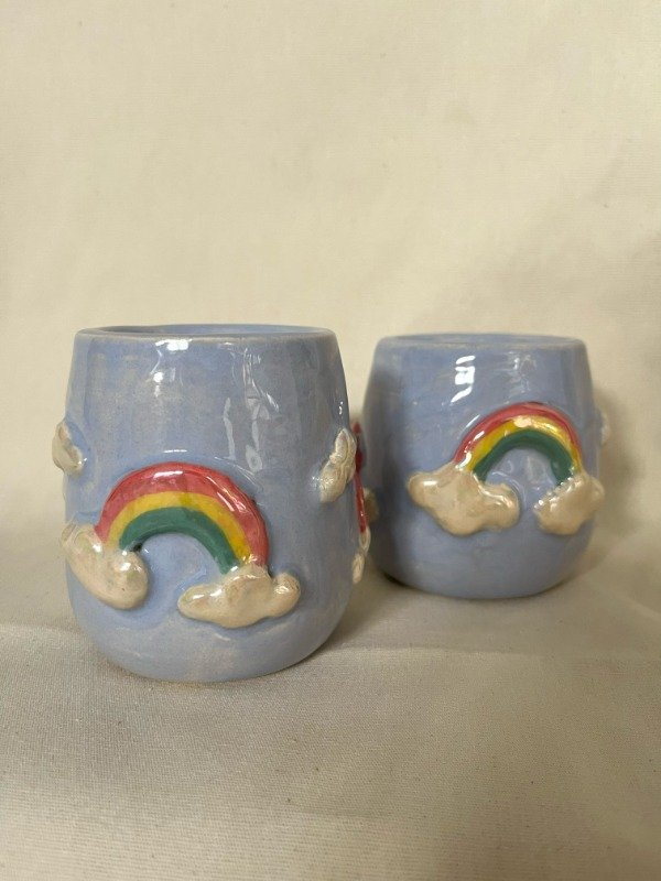 Matecitos hechos en torno alfarero, con nubes y arcoiris modelados.