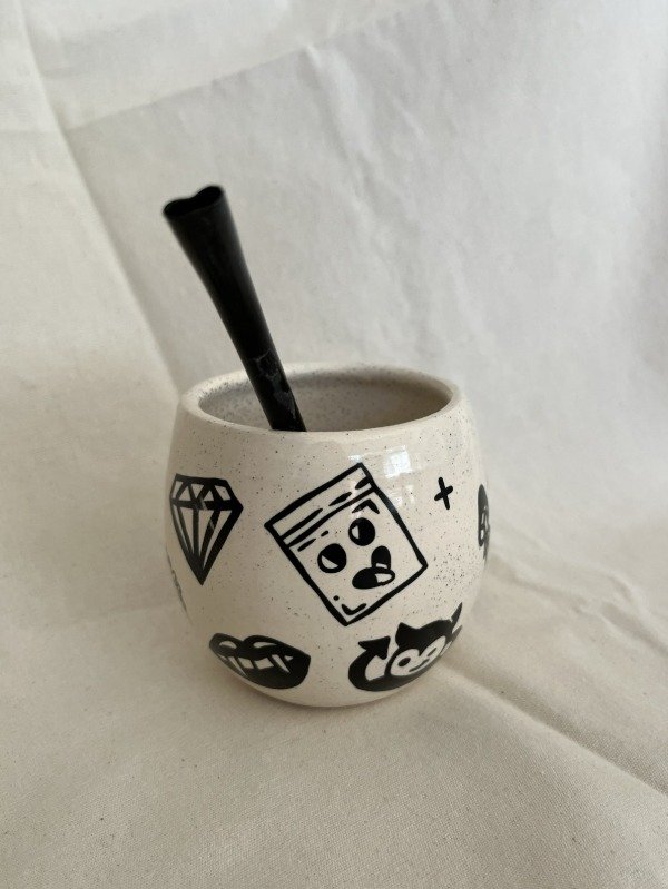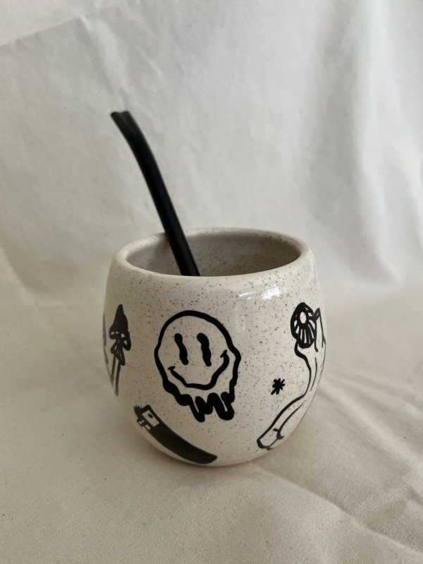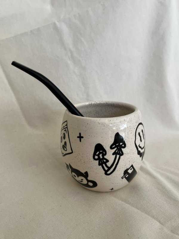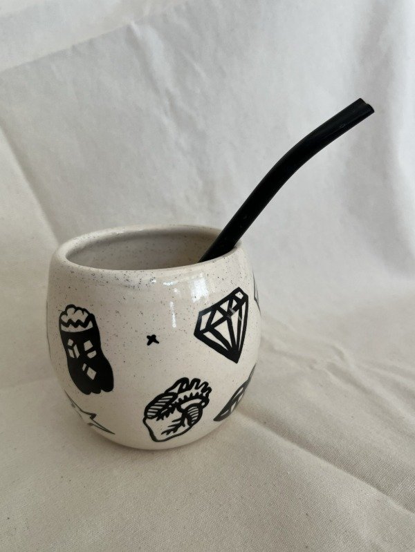 Mate hecho en torno alfarero, esmaltado con blanco jaspeado y con calcos ilustrados por nosotras.